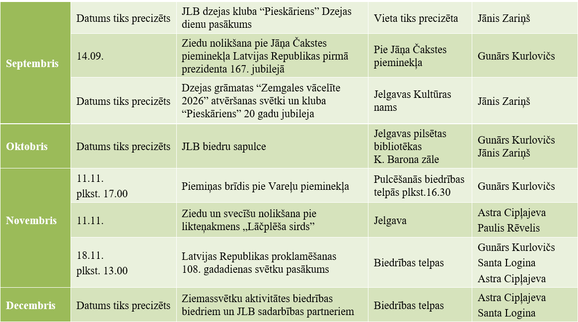 Jelgavas Latviešu biedrības mērķi ir sargāt un kopt latviešu tautas kultūru, valodu, tradīcijas, dzīvesveidu, nacionālo identitāti, nostiprināt nacionālās piederības un valstisko apziņu, atbalstīt izglītības, zinātnes, mākslas un literatūras attīstību, pētījumus latviešu tautas vēsturē, etnogrāfijā, Latvijas dabas un kultūras pieminekļu aizsardzības pasākumus.